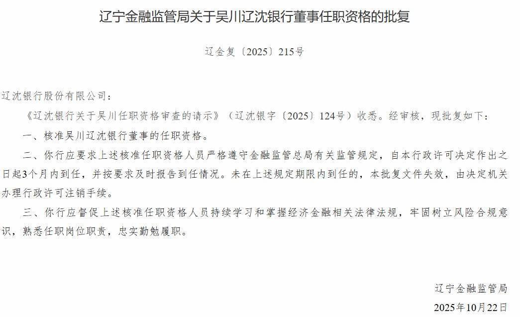 【大河财立方消息】10月27日联华证券,辽宁金融监管局网站发布批复,核准吴川辽沈银行行长的任职资格。