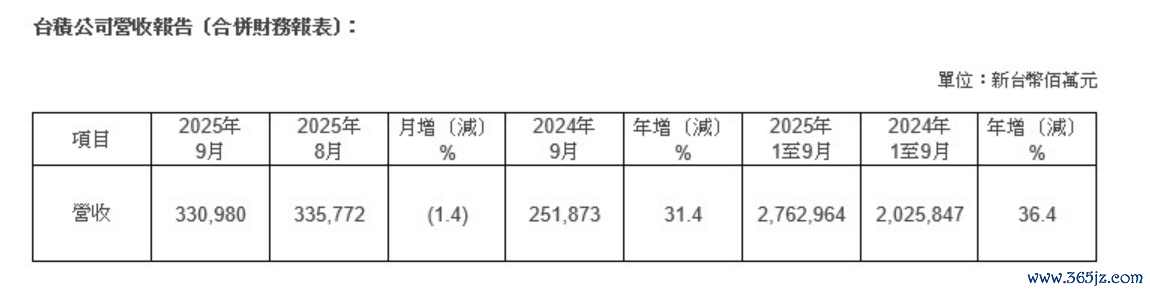 台积电:9月合并营收3309.8亿元新台币 同比增加31.4%福牛财经台积电:9月合并营收3309.8亿元新台币 同比增加31.4%